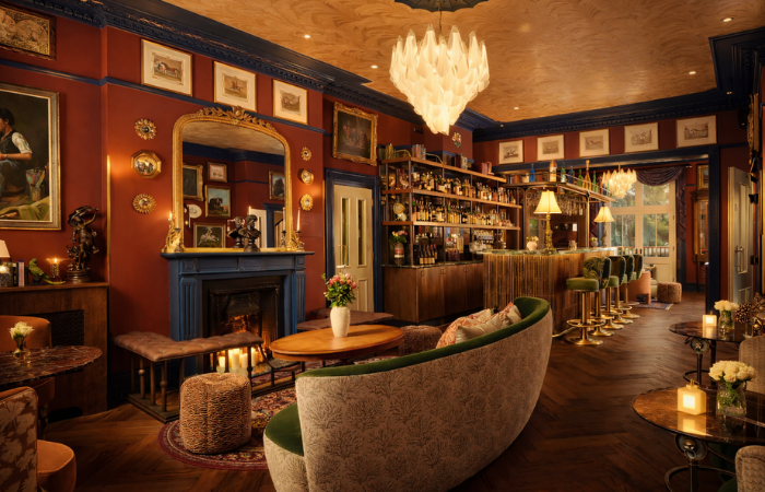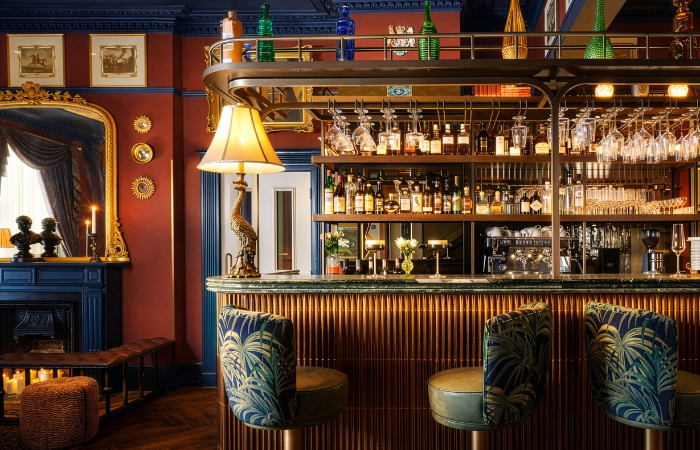 Public areas are arranged as a sequence of richly toned rooms, with palettes becoming deeper as one moves through the building. A brass-detailed bar forms the social focus, linking the spaces and reinforcing the townhouse’s natural rhythm.