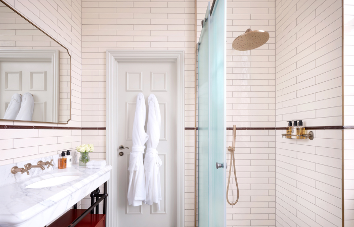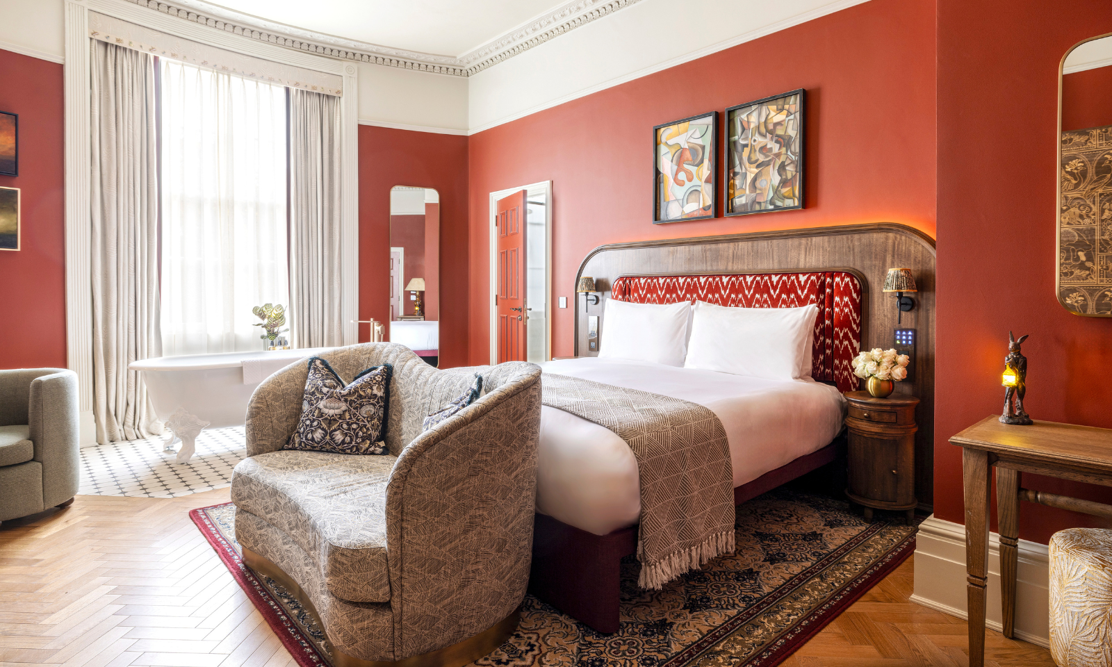 Guestrooms follow two distinct schemes. Classic and Deluxe rooms celebrate craftsmanship and creativity, expressed through soft neutrals, tactile materials and quietly detailed joinery. Grand rooms and Junior Suites introduce a richer palette of paprika tones, expressive trims and curated furnishings, creating a sense of warmth and collected sophistication. Two of the Junior Suites feature freestanding bathtubs, positioned to capitalise on garden views enjoyed through all sash windows.