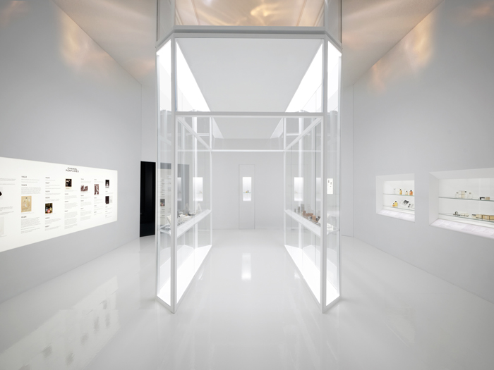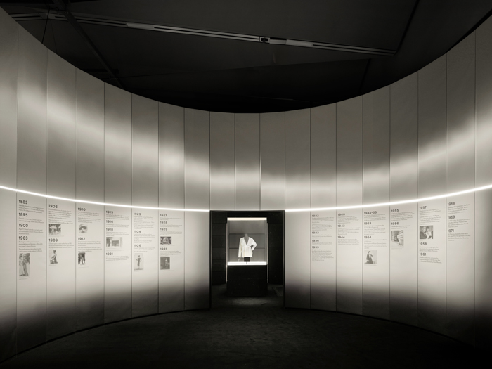 Exhibition designers Storey Studio looked to create a feeling of purity in line and proportion, along with a sense of timeless elegance, in their design approach. The individual spaces transport visitors to places Chanel frequented and lived, from the La Pausa villa on the Côte d’Azur to the iconic staircase at Rue Cambon, the location of Chanel’s boutique and haute couture salons, as well as her own apartment.