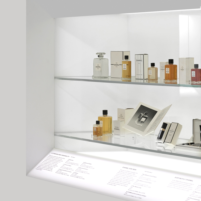 The rotating, glowing light in The Perfume Room, which has its own structure within the exhibition space, is one of the stand-out lighting features in the exhibition, along with the bespoke, abstracted chandelier in the eveningwear area, where the Rue Cambon staircase has also been re-created. Light moves constantly across the stair at the exact tempo of a film, projected onto the panels alongside and above the stair, which features archive footage of Chanel herself.
