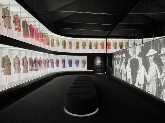 The stunning double-height vitrine room, showcasing Chanel’s classic evolutions of the lightweight tweed suit
