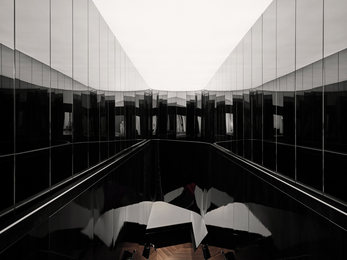 Dramatic black laquered panels to the staircase leading down to the exhibition
