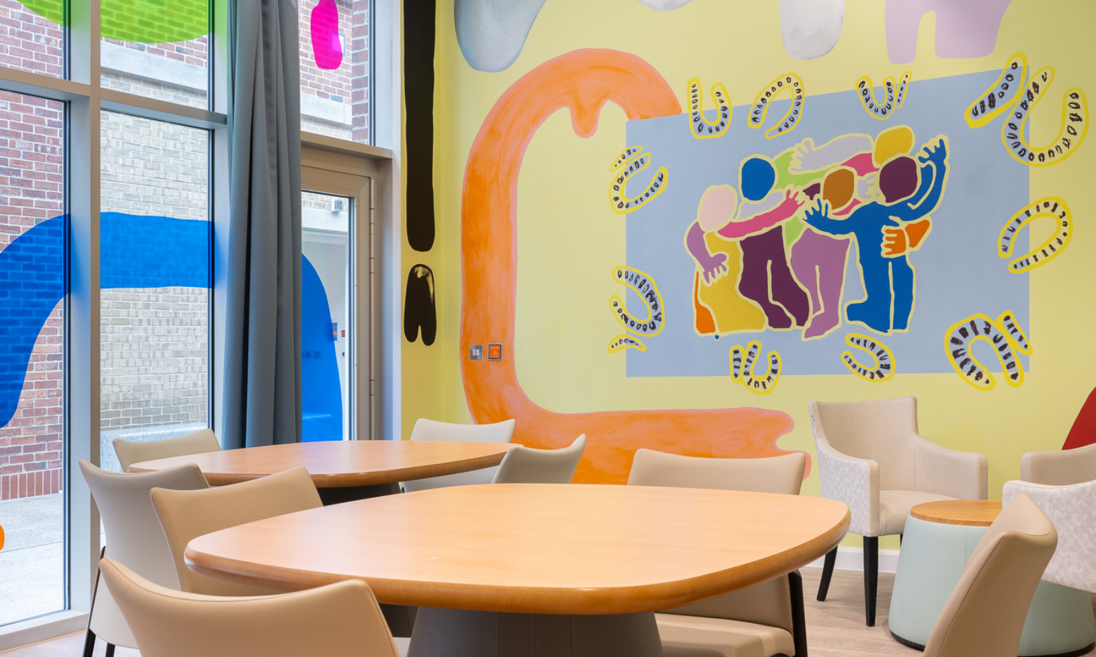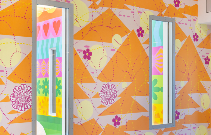 Booth’s distinctive, joyfully graphic language, full of bold outlines and unapologetic colour, has been used to lift areas that often suffer from visual monotony, creating spaces that feel animated and socially open without tipping into overstimulation. While Bruton’s layered patterns and softer chromatic shifts introduce a sense of rhythm and tactility that gently dissolves the hard edges typical of psychiatric interiors.