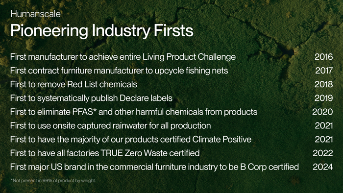 Many of those decisions have placed Humanscale ahead of the curve, from being the first to create a climate-positive certified product line, to launching a remanufactured furniture platform, to investing in ocean plastics and regenerative design before they were industry trends, and becoming the first major commercial furniture brand to earn B-Corp certification. But being first has its own risks.