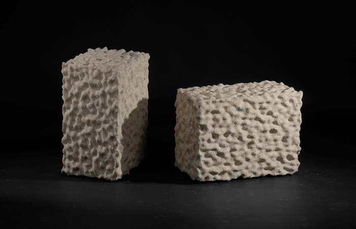 Many of the designers involved have taken their recipe formulations further, creating contexts for their output by manipulating their forms and introducing potential functionality. Recent Designer in Residence Lapatsch | Unger’s project Habitat investigates how new material developments might allow for co-existence with other species. By combining biochar derived from biogenic residues through pyrolysis with a pine resin binder the design duo has created a collection of other-worldly archetypes. The unique material “is condensed, but not unchangeable (and ) the objects have tendencies that are inherent to living systems: the ability to change, to decay and to return to nature as nutrients.” When nestled within the natural landscape the sculptural forms therefore encourage interaction and co-habitation with all living forms.