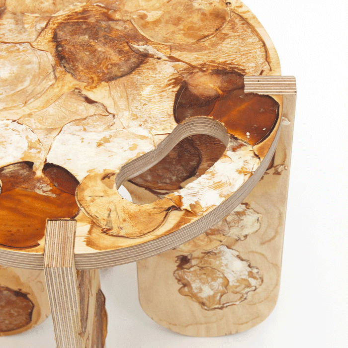 Mycelium, the root-like structure of fungus, has been on the rise as an alternative biomaterial for a few years now, although often in the form of objects and surfaces “grown” from composite materials that also contain wood waste or straw. Designer Paulina Heidlberger however explores the possibility of fungi as a veneer with her range of Fungiture. The surfaces she creates require no adhesive, instead using heat to press mycelium-based materials onto wood, creating entirely unique objects in the process.