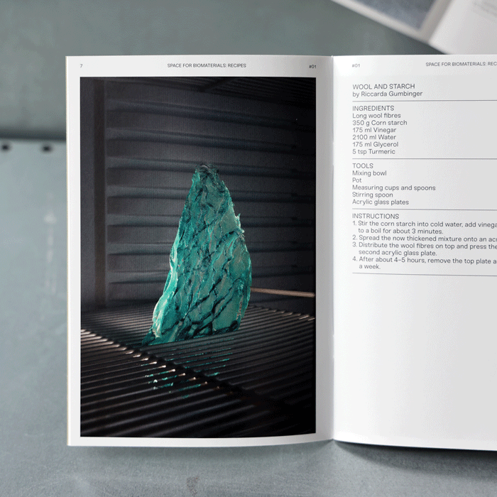 Positing, discussing and testing ideas in practice with diverse audiences and collaborators is the common thread that runs through each of the four groups, with a shared desire to discover sustainable alternatives a core tenet of them all. This practice is underlined by the SPACE FOR BIOMATERIALS inaugural offering, which includes a free zine of 16 material recipes. Working at the intersection of design and materials science, the team of design students was prompted to undertake an experimental research-through-design process in the university’s new Bio Lab, with the aim of producing alternatives to petroleum-based materials. This open approach invites any inquisitive reader to play with the recipes themselves, with clear ingredients, tools and instructions laid out alongside beautiful imagery of the team’s own experimentation. The constituent parts are varied but generally easy to get hold of, and include the likes of invasive Japanese Knotweed, wool, starch, algae, seaweed and apple. The results are equally varied, with an array of tantalising forms, textures and properties made possible by some unconventional variations on cooking, which include boiling in detergent, simmering in glycerol and whisking with spirulina.