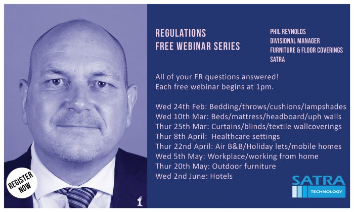 WATCH: FR WEBINAR SERIES – Beds/mattress/headboard/uph walls Focused discussion on FR requirements in collaboration with SATRA, looking at beds, mattresses, headboards and upholstered walls. 22 March 2021 FR Webinar Series