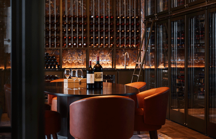 The intimate wine cellar, in which to sample wines from the 2,000 bottles on site from 24 countries, features marbled textured wallpaper and further layers of leather, brass, marble and glass, adding richness and depth to the space.