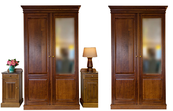 The wardrobe comes with solid oak doors & drawer fronts & oak veneered sides and back. Two drawers, tea tray, mirror and hanging rail.