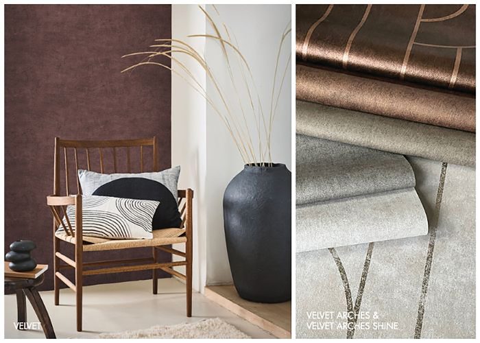 Starting with Velvet, with the smooth, luxe texture of authentic velvet. This pairs beautifully with Velvet Arches, an art deco-inspired print and Velvet Arches Shine, offering a mirror-like finish for added impact.