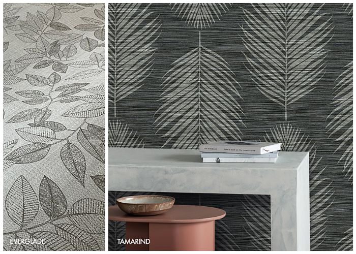 Continuing the botanical theme : Everglade’s delicate leafy silhouettes contrast with Tamarind ; a bold statement, large-scale gilded leaf print, shimmering with metallic accents for a luxurious, opulent feel.