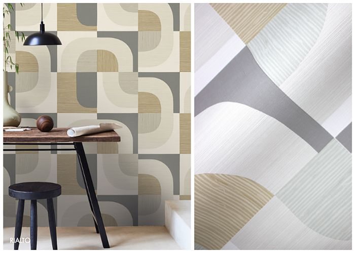 And Rialto, where a bold, large-scale retro print meets the natural texture of grasscloth. This mid-century modern design adds vintage flair, bringing a timeless yet vibrant touch to any interior space.