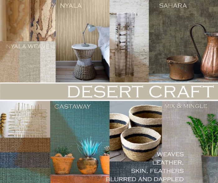 Desert craft styles are inspired by global design, and village life. Materials traditionally used such as skins, feathers and grasses are reinterpreted into contemporary effects, with colours reflecting the surrounding landscapes.