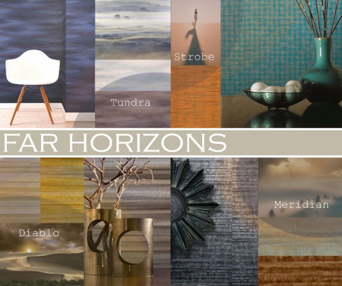 There’s a misty quality to the designs for Far Horizons evoking images of land and seascapes, sunsets and dawn. Shimmering and reflective surfaces with beams of blurred light are the inspiration behind these wall coverings, offered in the palest creams through to burnt orange, teal and black combined with gold.