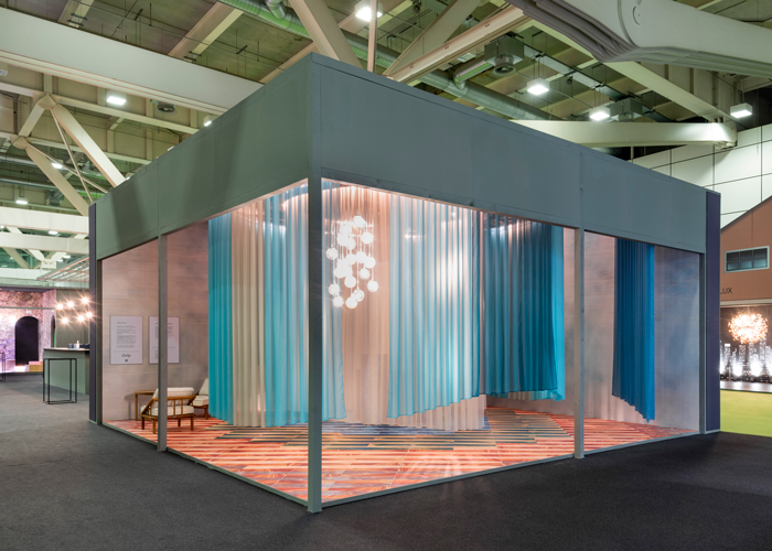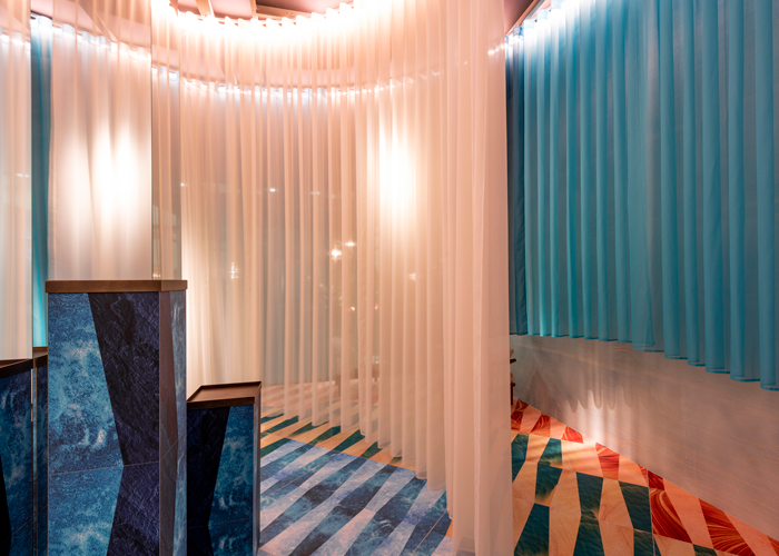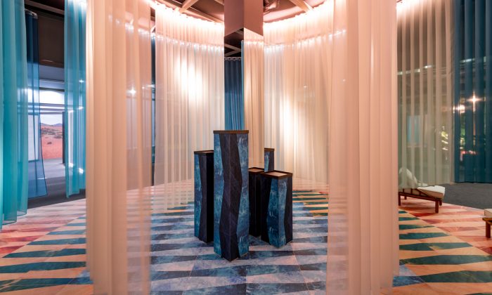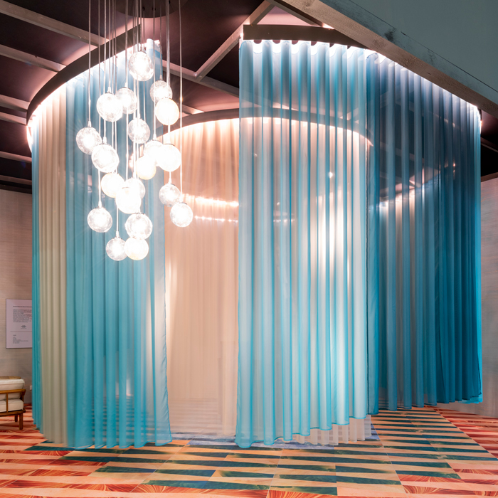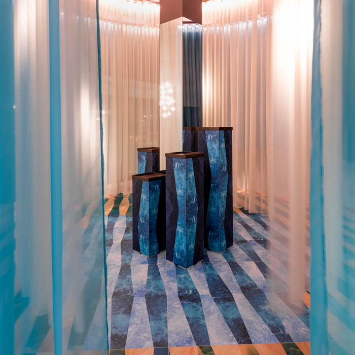 Faro Barcelona provided the fans positioned in the centre of the installation that recreate the effect of moving water, and finally, Jannelli & Volpi produced the wallpaper that was designed by THDP and inspired by natural textures. A yoga for the mind that takes visitors to a parallel dimension.