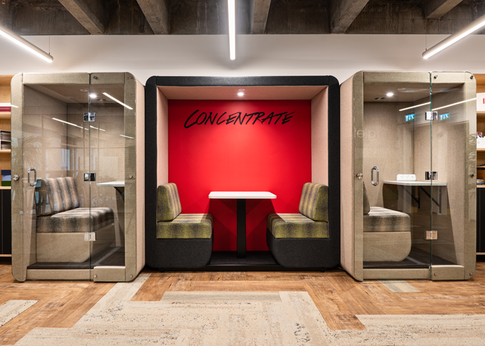 Using a mixture of modular units, meeting pods, and meeting rooms means that each eventuality is catered for (confidential meetings, informal chats, one-on-one chats etc), and stops bigger meeting areas being used by smaller parties.