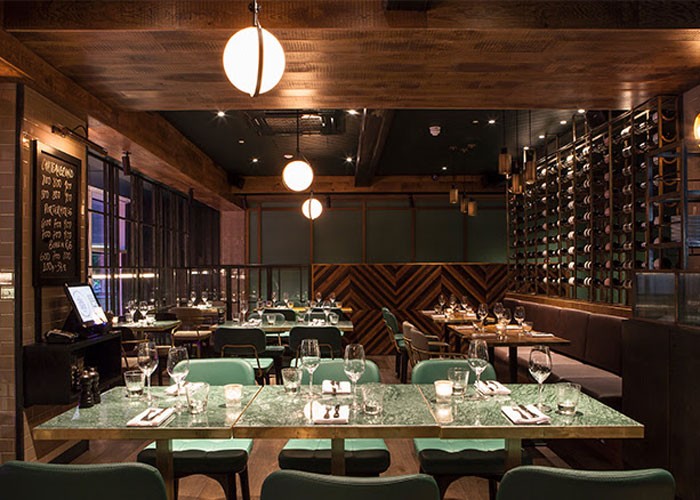 Upstairs leads to a stunning mezzanine floor that overlooks the main restaurant through framed black and steel screens. The dining area features bespoke wine units and unique displays of reclaimed leather belts illuminated by globe pendant lighting. Perfectly positioned at the back of the space is an intimate 20-cover private dining room, which opens out into the restaurant via frosted glass doors.