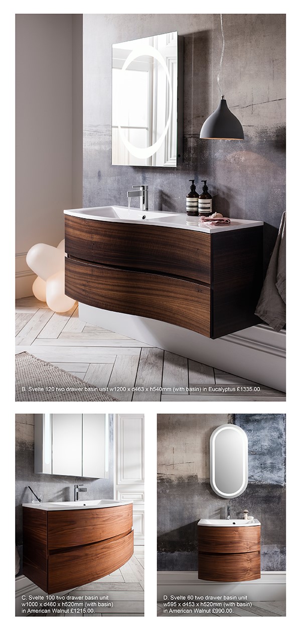 Clean lines and luxurious sweeping curves converge to form Svelte, the new bathroom furniture collection from Bauhaus. Featuring innovative new high performance materials and finishes, Svelte adds a designer look to any bathroom scheme. Manufactured using the highest quality materials throughout, the stunning furniture is available in three elegant finishes and four size options. Choose from the warm wood detail of the new exotic Eucalyptus finish or the ever-popular American Walnut option or opt for a crisp and timeless White Gloss shine.
