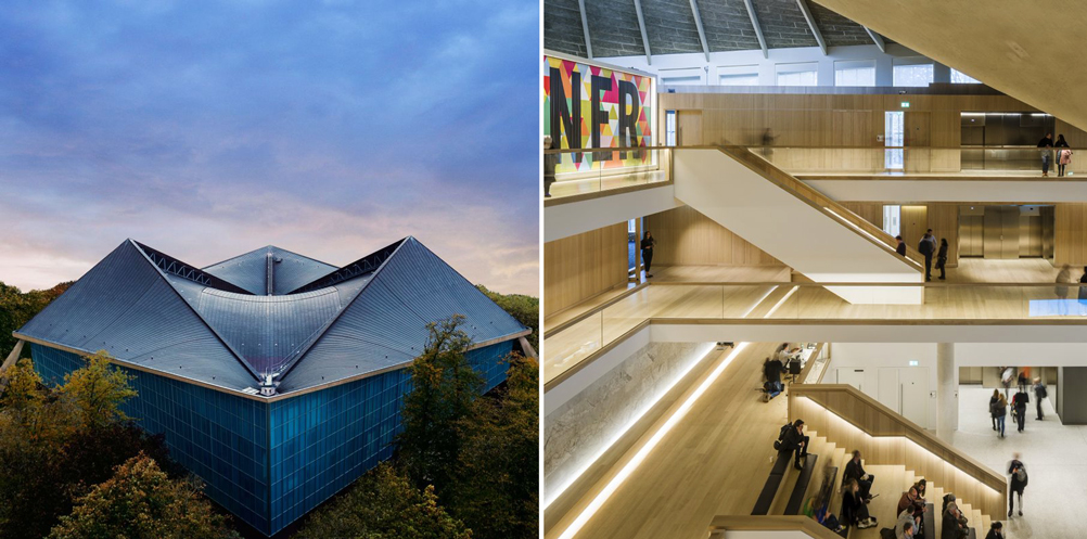 The large atrium, which features a broad flight of stairs providing a ‘place for people to pause,’ is at the centre of the building and allows the hyperbolic paraboloid roof to be admired.