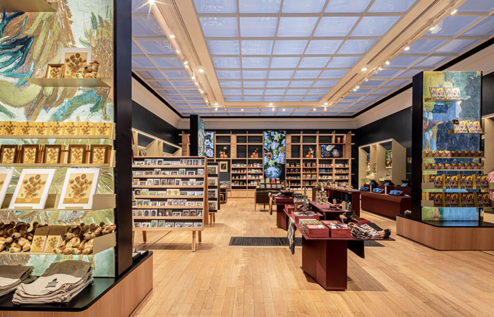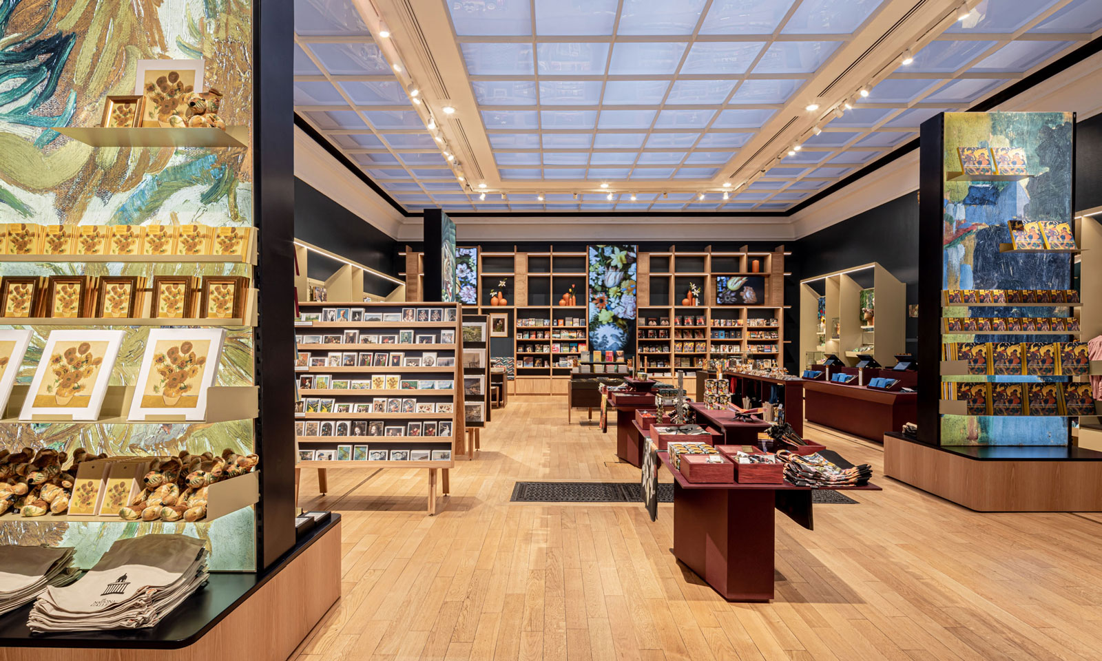 Oversized illuminated panels act as beacons to intuitively draw people in through the three entrances to the Portico shop. Each panel captures ‘crops’ of much-loved paintings, such as Van Gogh’s Sunflowers (1888), Monet’s The Water-Lily Pond (1899) and Rousseau’s Surprised! (1891) allowing visitors to get up close with the techniques, brush strokes, pigments, and canvases of the art in reproduction form, deepening the engagement and appreciation of each artist.