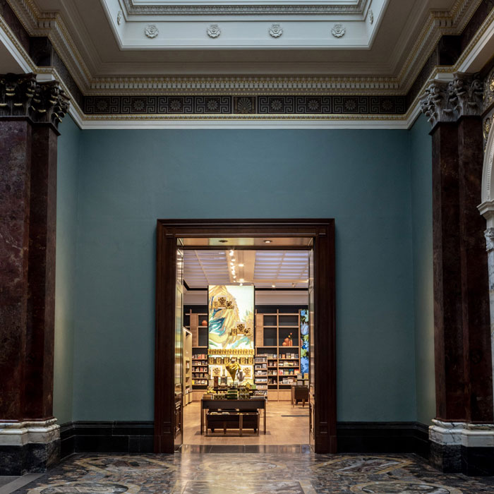 “Part of our design response was to surprise visitors with more playful, unexpected links to the Gallery’s rich heritage. We wanted to create moments of fun throughout with subtle animations of the collection or putting a modern twist on the Gallery’s original finishes. The final store palette includes numerous nods to the Gallery’s history such as the bold, geometric print in the seating nook supplied by Gainsborough inspired fabrics that also provided the original wallpapers in the Gallery spaces, or the Portico Marble texture showing up a backdrop of all the store graphics. The final design and palette of the Portico Shop is a true celebration of the Gallery itself”.Rina Keane, Senior Designer leading the project for Lumsden
