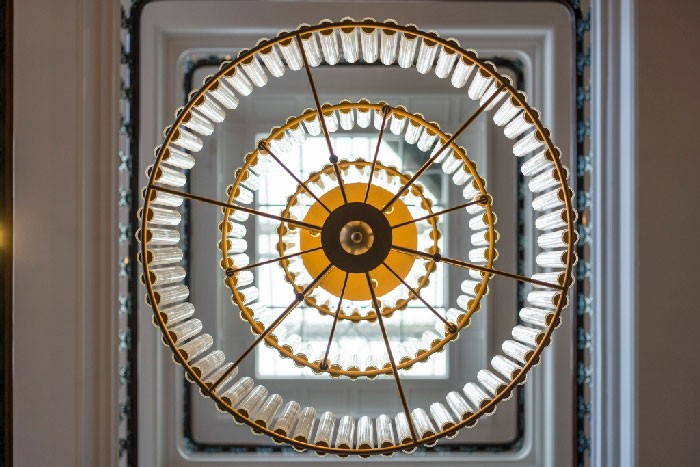 Beautiful, bespoke chandeliers, made up of faceted, cut crystal baguettes set within in bronze frames, were developed between Goddard Littlefair and Heathfield, there are three chandeliers in the Garden Room and three more in the Lobby Lounge, one of which, which hangs down through the stairwell, is triple-tiered.