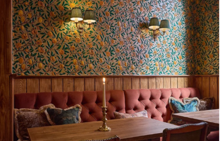 Comfort and character are introduced through banquette seating in aged leather and velvet. A sense of history has been layered back in through a salvaged timber fireplace and reclaimed light fittings. And then the piece de resistance is the hand-painted embossed Fruit wallcovering from the Morris & Co. collaboration collection.