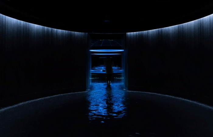 Guests step beneath a cascading waterfall into a simulated tropical downpour. Spatial rain sound envelops them. The scent of petrichor rises. Reclined on vibroacoustic lily pads, they gaze up at a projection of the towering kapok tree – the legendary Lupuna – as day cycles into night overhead.