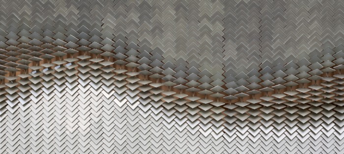 Composed of over 8,000 hand-crafted glass tiles, in an array of vibrant matte and metallic colours, each of the four structures adopts a scale-like composition with overlapping tiles that create a sense of depth and movement. The sculptures were also lit up from within, and omitted a warm glow at nightfall, rendering them functional at all hours of the day.