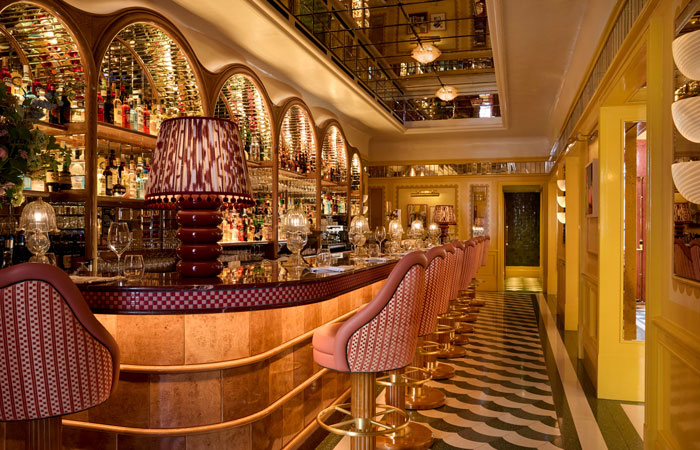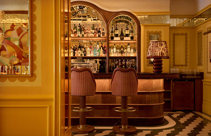 The impressive, long stretching bar immediately creates a theatrical atmosphere, featuring a bevelled mirror ceiling coffer and a curved back bar. The bar features a high gloss warm timber front, with a playful twist of red and pink mosaic tiles in the profile, complementing the bespoke bar stools upholstered in a geometric pink fabric.