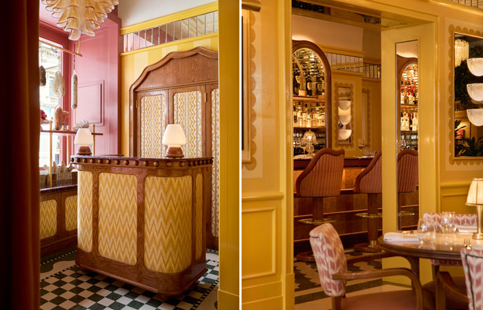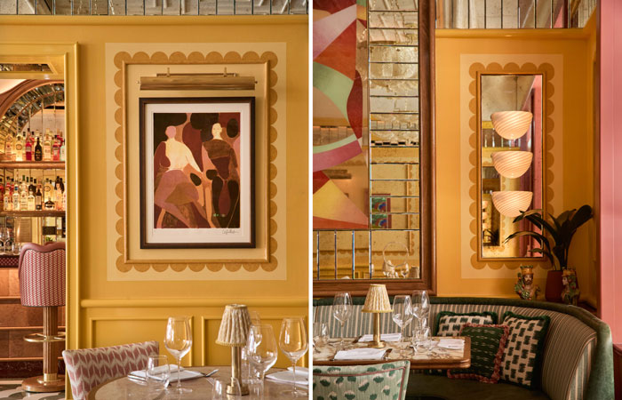 In the main dining room, the warm yellow toned walls continue, paying homage to the subtle frescos of venetian villas. Fettle have modernised the look and feel of the restaurant through colour blocking and introduced details including scalloped borders and checkered patterns. The studio has also framed the walls in painted timber panelling to establish a rhythm that evokes the restaurant’s classical roots.