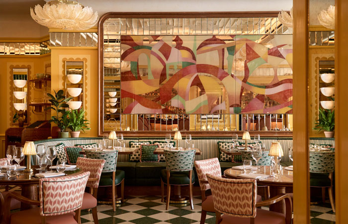 Fettle have incorporated sections of bevelled mirror to bounce light from the array of chandeliers that adorn the restaurant space. Intervals of large colourful verre eglomise murals frame the walls with a mix of bespoke upholstered chairs and banquette seating in green and pink shades.