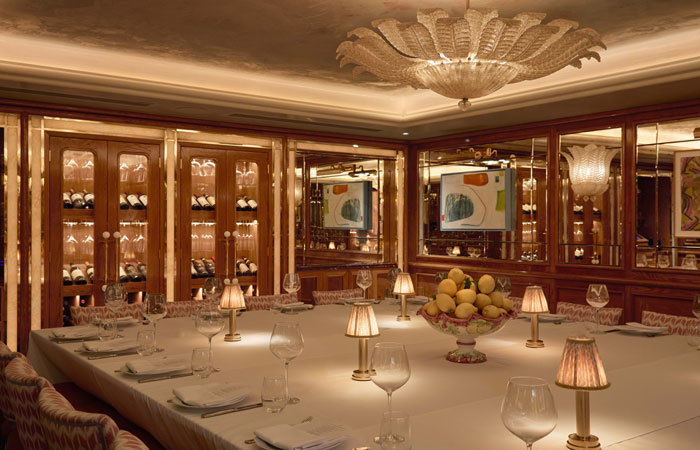 Moving downstairs to the Private Dining Room, the elegant space is softened by an inset bespoke rug that mirrors the tones of the hand painted sky mural on the ceiling above. The room features bespoke wine display cabinets and a range of eclectic artwork on mirror panelled walls.