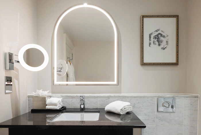 For this distinguished project, Luma Mirrors designed and supplied 246 front-illuminated, anti-fog arch-shaped bathroom mirrors finished in sleek chrome. Dubbed the Chester, this mirror model balances form and function, providing guests with crystal-clear visibility and consistent lighting—regardless of humidity. The arched design introduces softness to the interior palette, while the chrome finish complements the timeless luxury of the hotel’s bathrooms.