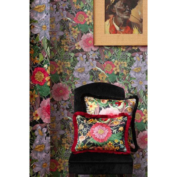 Make a statement with the Berkley Blooms capsule collection which includes digitally printed wallpaper, fabric, velvet fringed cushions and art rug. The distinctive design features delicately detailed psychedelic blooms surrounded by intricate foliage and intertwined vines.