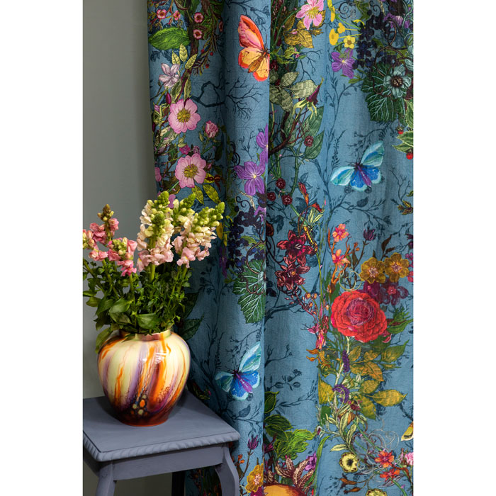 Timorous Beasties has cultured blossoming briars, fruiting vines, bright beetles, and butterflies with Bloomsbury Garden fabric. This is an ideal design for curtains, wall-hangings, and is also available as a wallpaper.