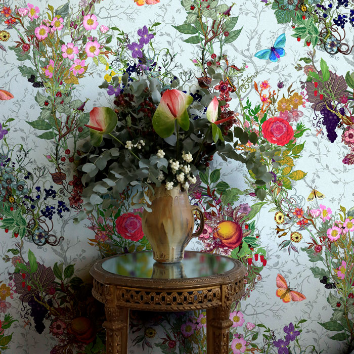 Random Ruskin is a purely floral digitally printed wallpaper that repeats every ten metres. The floral motifs change from sparse to dense, adding an air of randomness to the repeat, a feature that is rarely seen in wallpaper design.