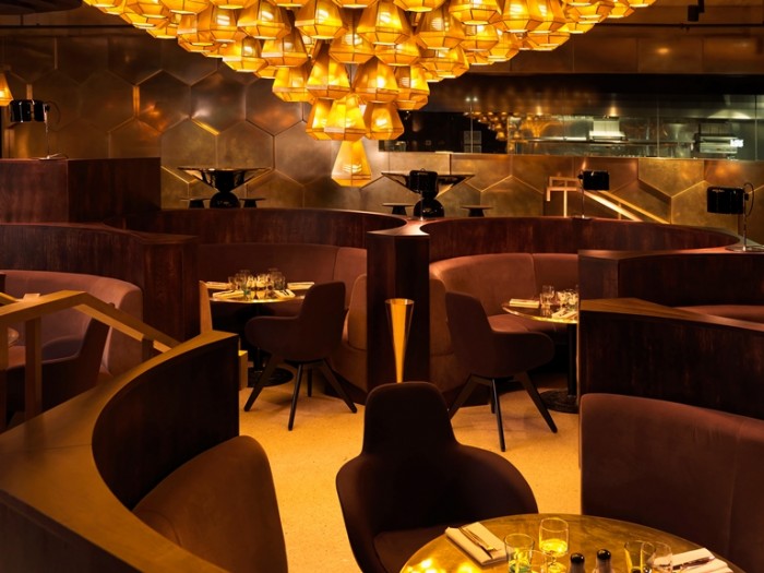 Tom Dixon began with the idea of making the restaurant an integral part of its modernist sur-roundings. The technical areas of the building are exposed for maximum space, and concrete – the superstar of brutalism – is exploited in every possible texture.