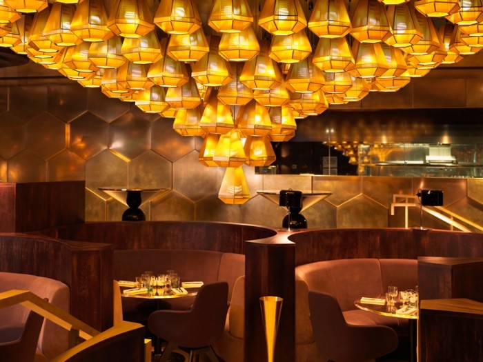 Hexagons are used as a recurring theme, recall-ing the geometric and modular concepts of the 1970s. This theme is clear in the spaces formed by the interlocking central bench seats, the brass detailing that frames the view to the kitchen, and again in the design of the 124 metal lampshades of the chandelier, which presides over the dining room as the central pivot of its decorative style.