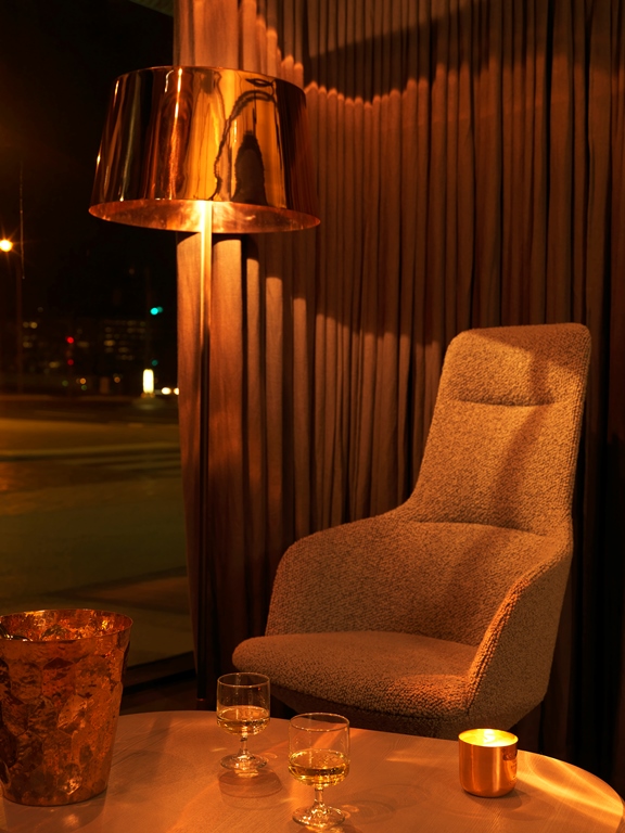 Lighting is central to Tom Dixon’s design scheme, which showcases his talent for creative mood making. An orchestra of different lamps provides controlled lighting designed to reflect effectively from superb surfaces of wood, metal, stone and paint, and enhance the colours used for fabrics and leathers.