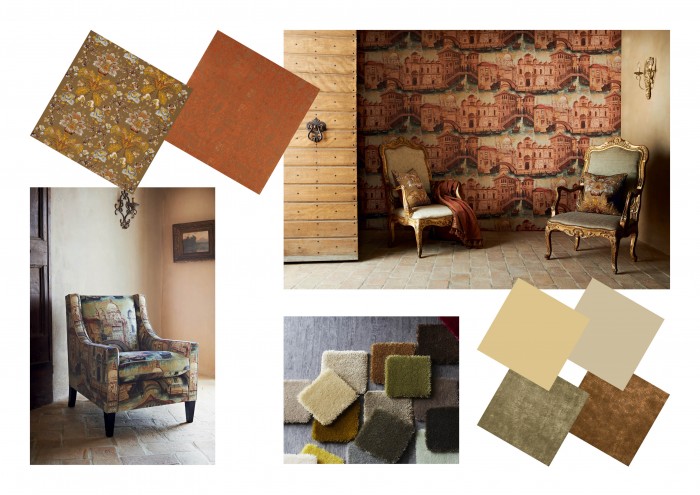 Products from bottom clockwise L-R: The Gondolier 321247, Zoffany Rugs, Saffron paint, Pebble paint, Curzon 331107, Curzon 331101.