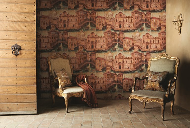 The Gondolier, from the Zoffany Tespi collection seen in wallpaper above and printed onto a sumptuous velvet quality below, transports us to the canals of Venice at different times of the day.