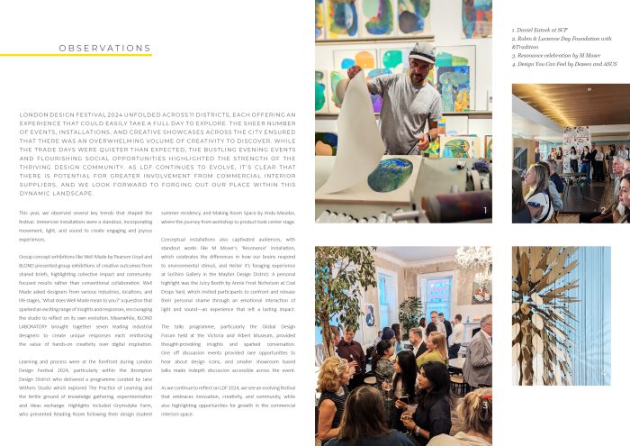 London Design Festival 2024 unfolded across 11 districts, each offering an experience that could easily take a full day to explore. The sheer number of events, installations, and creative showcases across the city ensured that there was an overwhelming volume of creativity to discover. While the trade days were quieter than expected, The bustling evening events and flourishing social opportunities highlighted the strength of the thriving design community. As LDF continues to evolve, it’s clear that there is potential for greater involvement from commercial interior suppliers, and we look forward to forging out our place within this dynamic landscape.