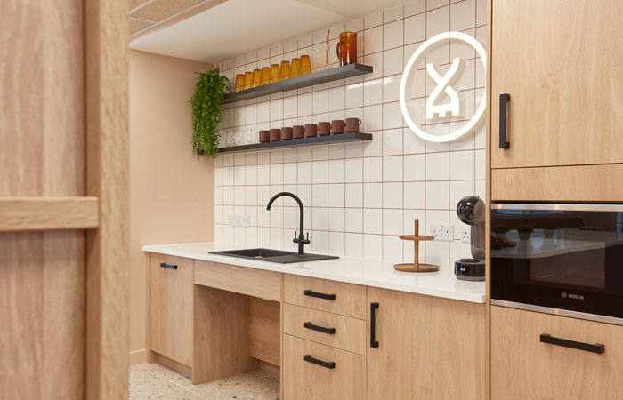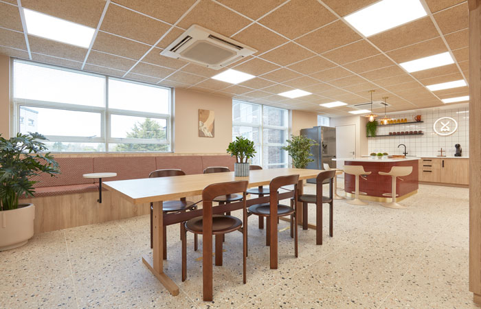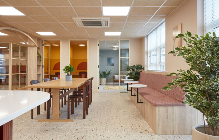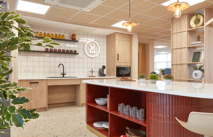 The communal kitchen encourages several scenarios and caters for all. A generous central island which also doubles up as a meeting area, is clad in deep red tiles from Archi-tile and carries a quartz worktop. Hay’s new Passerelle dining table features alongside their classic Rey chairs. A bespoke banquette upholstered in Linwood Harlequin fabric and café-style seats – all speak to a brief which encourages gathering and sharing. Archi-tile Terrazzoprinted porcelain tiles compliments soft, peach-nude walls with handmade marquetry artwork from Chelsea Vivash, sourced through Partnership Editions. Economical, square bright white kitchen tiles are given a clever contrast with burgundy grout and a neon sign provide a nod to the cafe culture from the surrounding area.