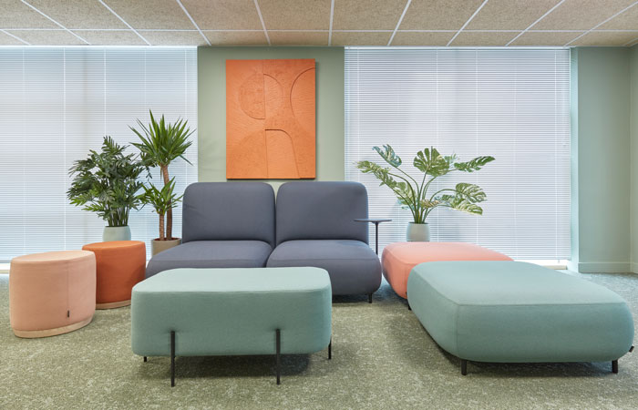Furniture systems such a Pedralis’ ‘Buddy’ – tables, poufs, and modular seating – were specified. A high-end, glass white board and large screen enable functional work in this more casual setting.