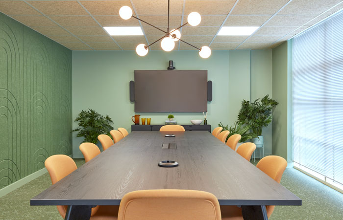 Fashionable brown glass and wood tables coordinate with Soho House pieces trimmed in deep bronze. This space must be welcoming but also function across different styles of work including communal plus be a suitable hub for temporary staff. As a ‘virtual first’ company, online meetings are a must and so therefore are good acoustics. Two breakaway meeting rooms and two phone booths were created and clad in colourful acoustics from The Collective in brick-red and yellow.