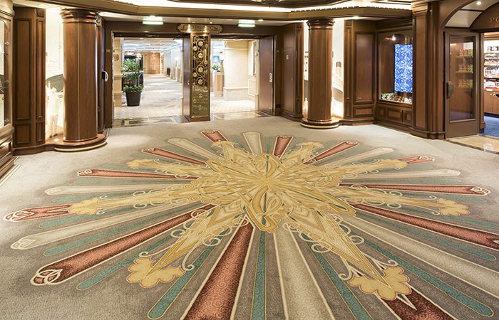 Working closely with Alan McVitty at MStudio Design and Cunard, Ulster’s brief was to supply exemplary luxury carpet throughout the ship. Ranging from the grand lobby stairs and landing through to an extensive range of shops, restaurants, suites, staterooms and cabins, Ulster created a variety of bespoke designs specifically tailored to match the décor of each specific area.