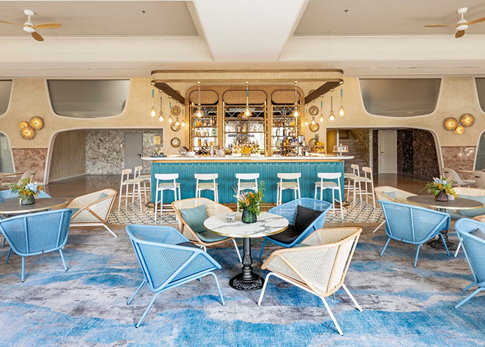 Inspired by the Sicilian attitude of welcoming, the new layout in the lobby melts the indoor and outdoor colour palette together in an elegant style. For this area, the rug design is inspired by the ocean meeting the shore. This abstract look creates a feeling of transparency and fluidity that sets a relaxing tone for guests as they enter the hotel.