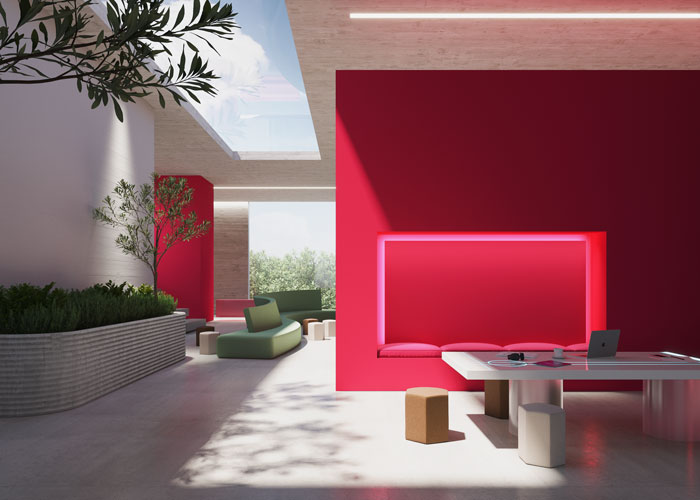 Viva Magenta takes centre stage in this beautiful workspace. The clean, refined space features comforting but sleek modular elements. The use of biophilic design oxygenates and invigorates the environment and provides a warming contrast to the future-forward 3D-printed concrete elements. Trees and plants have been incorporated to contribute to wellbeing, happiness and productivity. There is also plenty of natural light from the glass ceiling, which casts peaceful shadows and the allusion of movement reflected from the planting. The Viva Magenta wall, covered in Ultrafabrics’ Vivid Punch, adds a boost of enlivening colour. It divides the airy space and doubles as a booth where people can work, collaborate or socialise. Using bright white stone and warm brown woods and wovens on modular furniture grounds the space in earthiness. Rounded, organic sofas covered in Ultrafabrics’ green Volar Bio fabric complement the planting and reflect the outside greenery, thus harmonising the interior and exterior elements of the building.